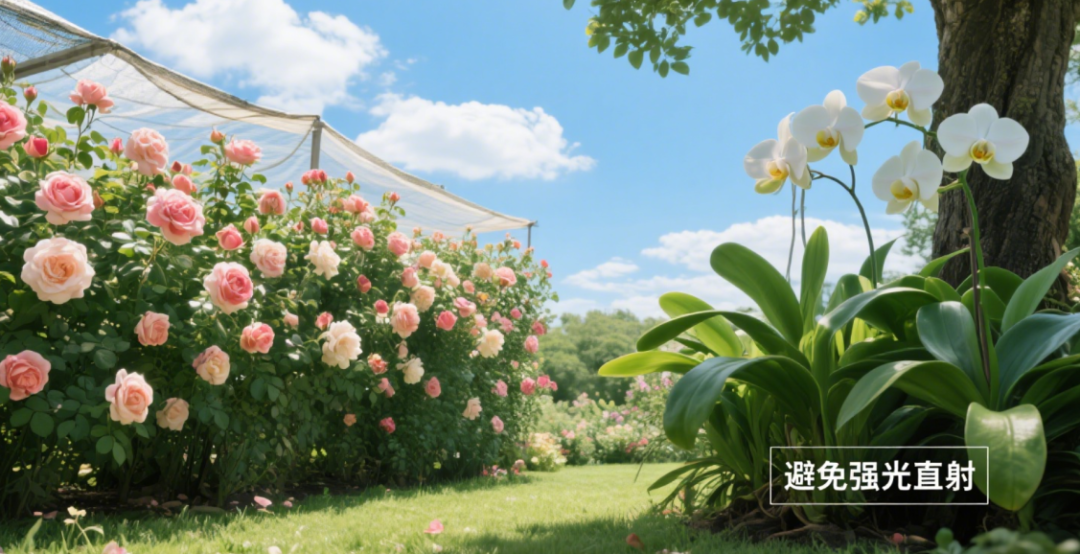 不同室外花卉对光照需求不同。月季、茉莉等喜阳花卉,需要充足的光照,但在正午高温时段,可适当遮阴,避免叶片被灼伤;兰花、玉簪等喜阴花卉,要放置在树荫下或搭建遮阳棚,防止强光直射。
