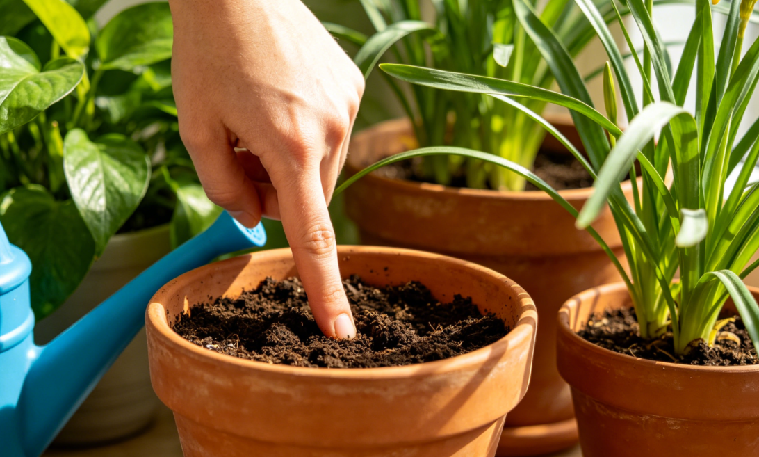 实操技巧:遵循“见干见湿”,浇水前手指插盆土2-3厘米,干透再浇透。绿萝等盆土表面发白、表层下1厘米干透后沿盆边慢浇,浇完通风;萱草每月浇3-4次,忌积水。