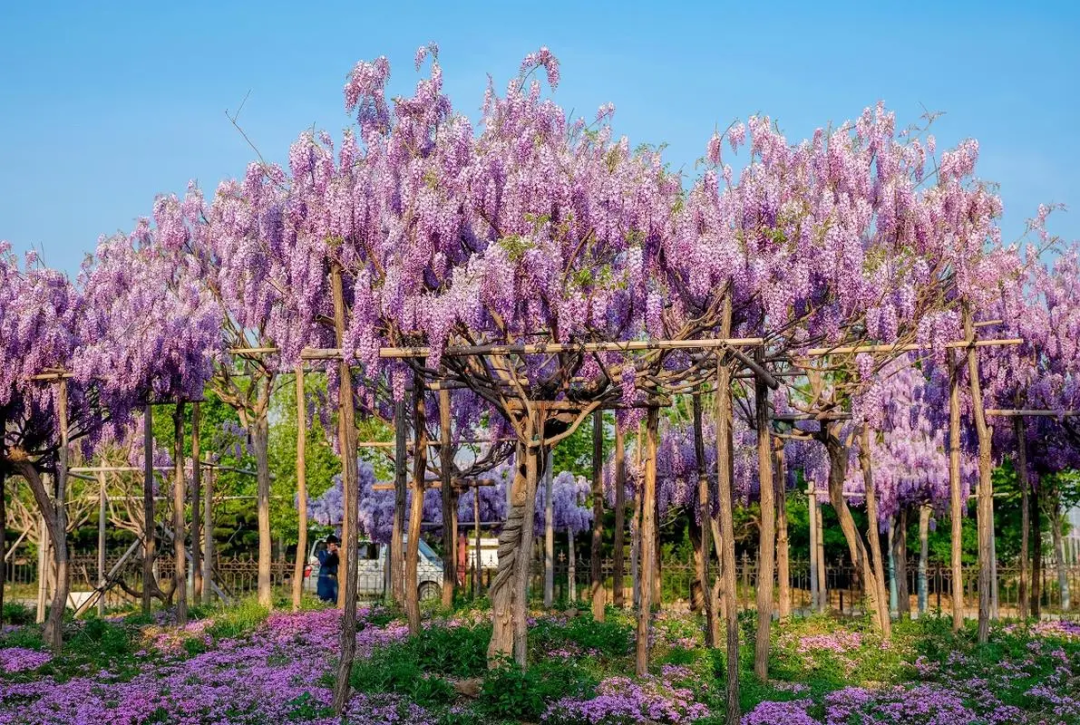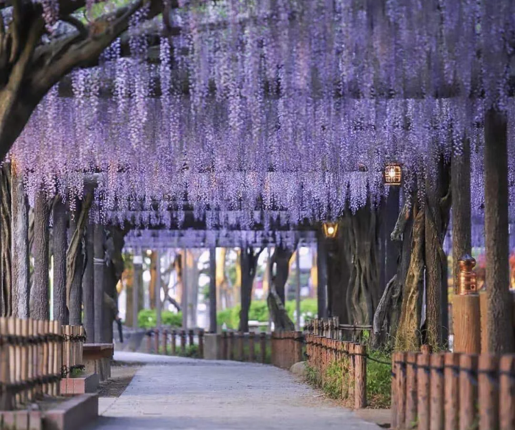 利用紫藤的缠绕攀爬性可搭建各种造型的拱门、长廊、棚架等,为了让其尽快成景,可在造型四周栽植较大的苗木,2年可成景观。可以利用紫藤茎秆柔软可随风飘摆的特点,将紫藤栽植于屋顶,引茎向下长可形成绿色的屏障,花期时景色更加宜人。