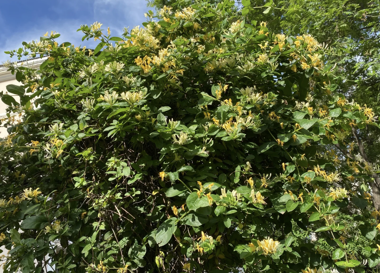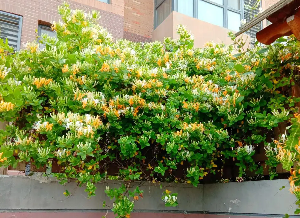 金银花是一种中药材,它也是一种藤本植物,它的花色也比较多,有红色、黄色,还有复色的。它们无论哪个品种生长非常的迅速,一颗不大不小的苗子栽到墙边上,只要找个网子固定,它就能够顺着网子快速的攀爬,一年就能够将整个墙面爬满,到了冬季就会落叶,春季回暖接着就长新芽直接开花,开出一面花墙,满院都是它的香味。