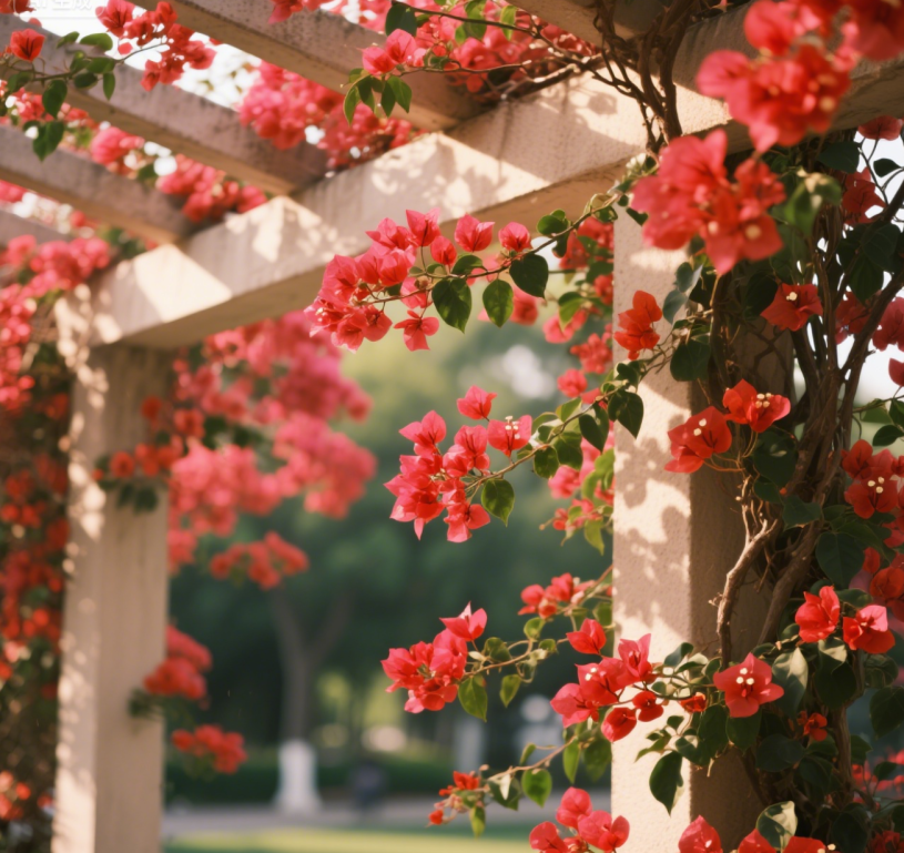 三角梅是夏日里最热烈的歌者,藤状的枝干上,红、粉、紫、白等色彩的苞片大而艳丽,宛如绚丽的云霞。这些苞片形状似叶,却比叶更鲜艳,比花更夺目。三枚苞片簇拥着小巧的花朵,密密匝匝地开满枝头,远远望去,繁花似锦,热情奔放,将夏日的炽热展现得淋漓尽致。