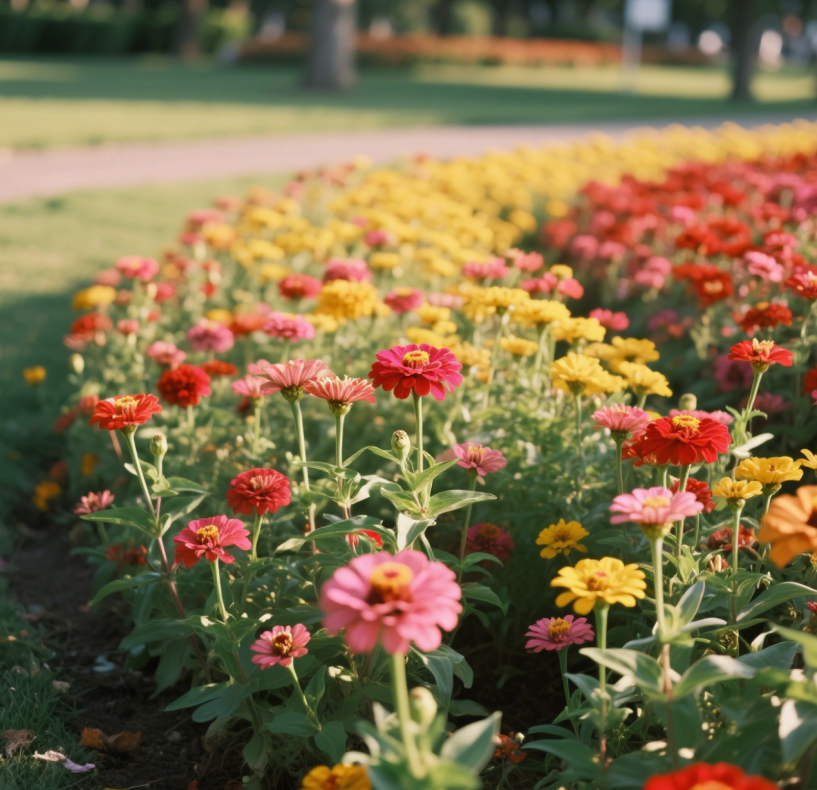 百日草从 6 月到 9 月,在公园的花坛中编织着五彩的梦境。红、橙、黄、白、粉等丰富的色彩交织在一起,单瓣、重瓣等多样花型错落有致。层层叠叠的花瓣,如同精心雕琢的丝绸,植株整齐排列,宛如夏日里色彩斑斓的诗行,诉说着季节的浪漫与温柔。