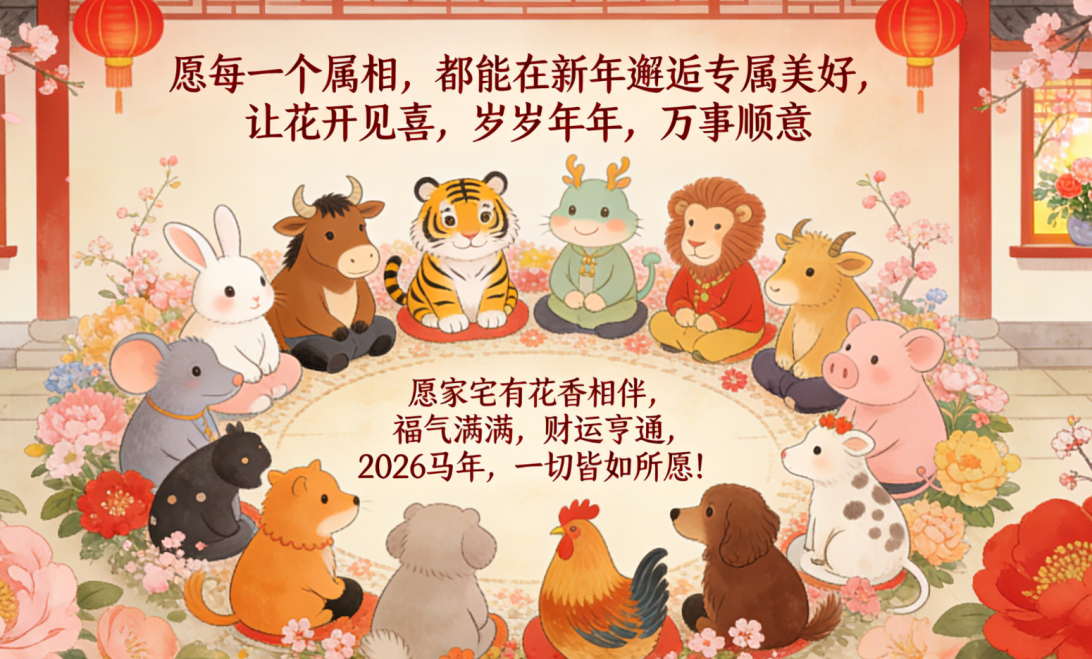愿每一个属相,都能在新年邂逅专属美好,让花开见喜,岁岁年年,万事顺意;愿家宅有花香相伴,福气满满,财运亨通,2026 马年,一切皆如所愿!